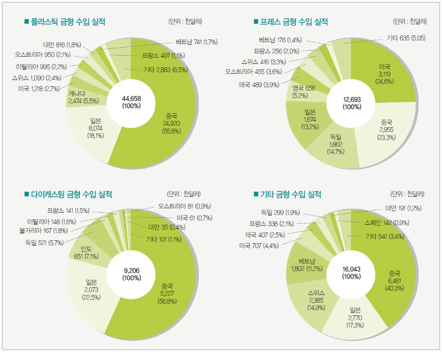 우리나라 2015년 상반기 금형 수입은 총 8,260만 달러를 기록해 2014년 상반기 수입 7,446만 달러에 비해 10.9% 증가했다. 품목별로는 플라스틱 금형, 프레스 금형, 다이캐스팅 금형의 수입이 크게 증가했으며, 전체 수입에서 19.4%의 비중을 차지하는 기타 금형은 22.2% 감소했다.