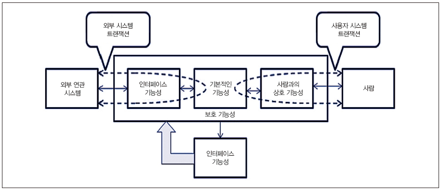 그림 5에서 사용자 시스템 트랜잭션은 관련 운용시나리오로부터 도출된다. 또한, 개발 중인 시스템이 외부시스템과 반드시 수행되어야 하는 다른 트랜잭션 사항도 있을 수 있다는 것을 보여주고 있다.