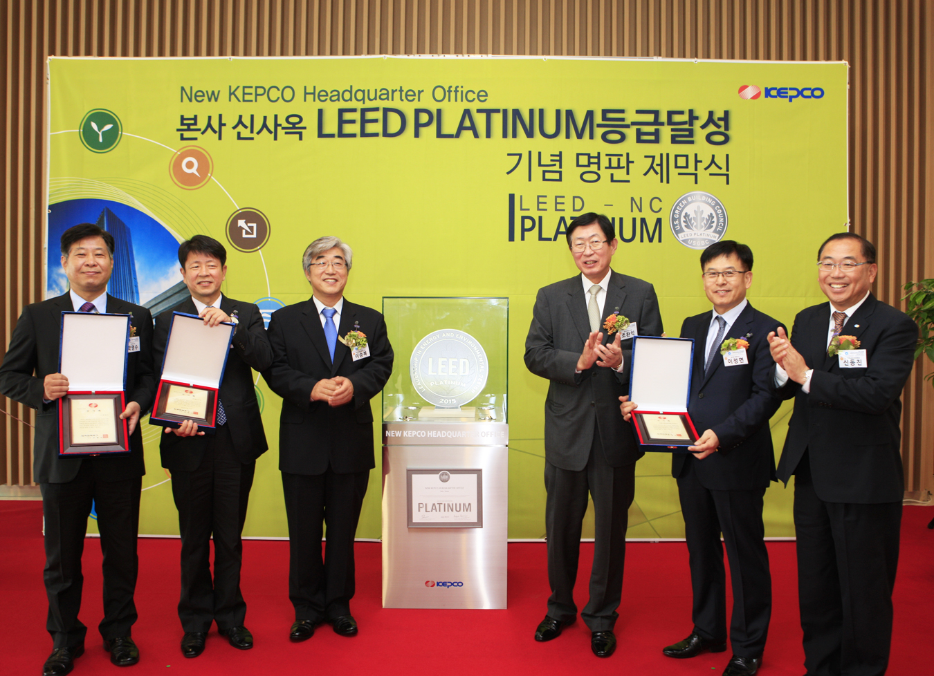한국전력(한전) 본사 신사옥이 미국 그린빌딩위원회(USGBC)에서 시행하고 있는 글로벌 친환경 건축물 인증제도 LEED의 최고 등급인 ‘Platinum’을 획득했다. 한전은 이와 관련, 한국그린빌딩협의회 및 시공사 관계자들과 함께 21일 본사에서 인증 명판 제막식을 개최했다.