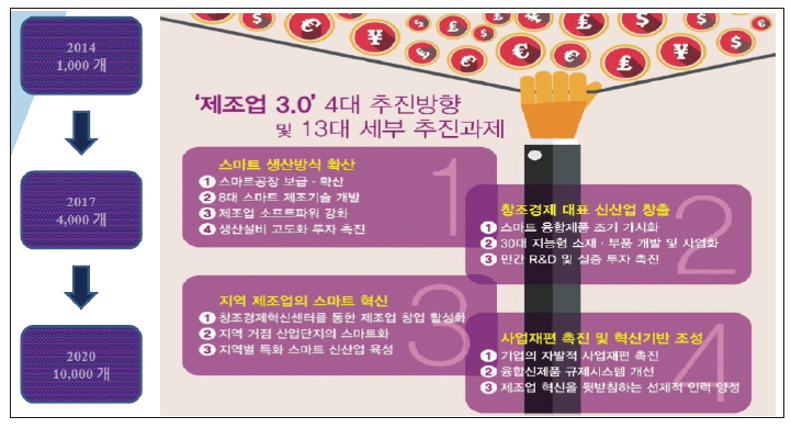정부의 ‘제조업 3.0’ 4대 추진방향은 스마트 생산방식 확산, 창조경제 대표 신산업 창출, 지역 제조업의 스마트 혁신, 사업재편 촉진 및 혁신기반 조성을 목표로 한다. 이는 지역 기반이든 기술 기반이든 다양성을 잉여가치화하는 것이며, 주력산업과 뿌리산업은 스마트화로 재편하는 것으로 풀이된다.