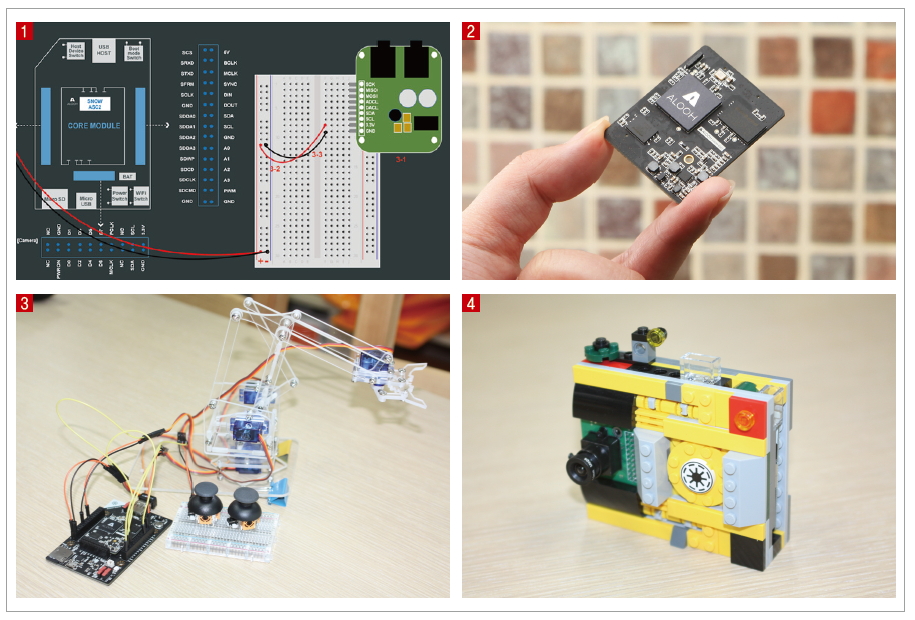 ALOOH는 제품의 기본 구성품만으로도 프로토타입을 제작하고 제품 상단의 코어 모듈만 분리해 상용화가 가능할 정도로 쉽게 구성되어 있다는 점이 가장 큰 장점입니다. 또한 고성능 데이터 처리 및 오디오·비디오 제품을 구현하기 적합하다는 특징이 있죠.