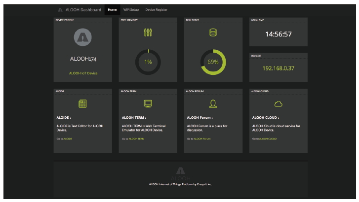 ALOOH는 적은 비용으로 쉽고 빠르게 사물인터넷 제품을 만들 수 있는 스마트 커넥티드 디바이스 개발 플랫폼으로서, 하드웨어 모듈, 클라우드, 애플리케이션 소프트웨어 개발 키트(SDK), 개발 환경 및 서비스 엔진을 플랫폼에 포함시켜 제공하고 있습니다.