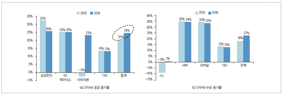 2016년 DRAM 시장을 살펴보면, 공급 증가율이 수요 증가율을 웃돌 것으로 전망된다. 올해 DRAM 수급의 경우, PC DRAM 수요가 급감함에 따라 마이크론의 비트 그로스(Bit Growth : 메모리 반도체의 전체 성장률)가 마이너스를 나타냈다. 2016년의 경우, 삼성전자의 비트 그로스가 32%에서 26%로 둔화될 것으로 전망되지만, 마이크론이 -3%에서 +23%로 정상화되면서 인더스트리 전체의 공급 증가율이 높아질 것으로 예상되고 있다.
