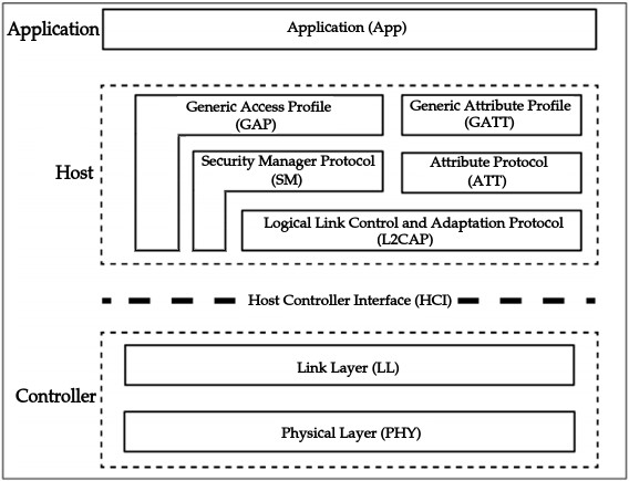 그림 1에서 보는 것과 같이 전체적인 블루투스 LE 프로토콜 스택은 크게 Controller와 Host의 두 부분으로 나뉜다. 애플리케이션은 이 스택의 호스트 부분에 속하는 프로토콜들이 제공하는 서비스를 사용한다.