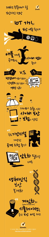 시만텍에서는 2016년 주목해야 할 보안시장 전망 8대 이슈로 ▲IoT 기기의 보안 이슈 확대 ▲애플 기기를 공격하는 사이버 범죄 증가 ▲랜섬웨어 범죄 집단과 악성코드 유포 집단의 경쟁 심화 ▲데이터 유출로 인한 사이버 보안 보험의 성장 ▲주요 기간시설 겨냥한 공격 위험 증가 ▲암호화 필요성 대두 ▲생체인식 보안 본격화 ▲게임화와 시뮬레이션을 통한 보안 의식 제고 등을 꼽았다.