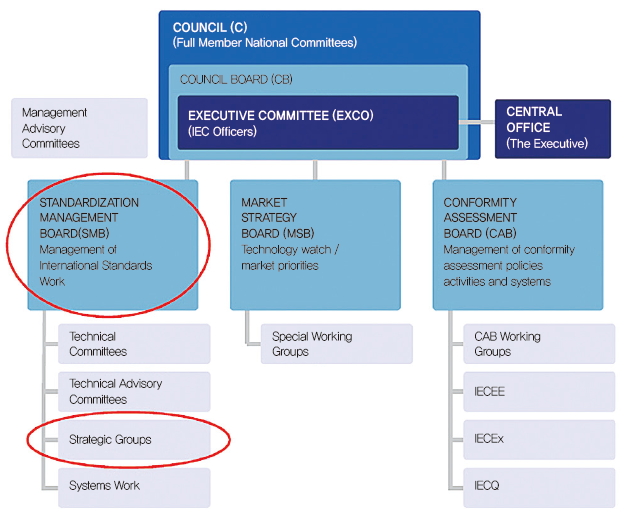 ▲ IEC 국제 표준화 기구의 구조. 표준을 직접 다루는 SMB 하위에 TC와 SG가 있다.
