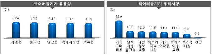 시계, 안경, 의복 등 형태의 웨어러블기기에 대해서는 ‘시계형(3.64점)’과 ‘밴드형(3.52점)’ 기기를 선호하며, ‘기기 구매비용(32.9%)‘ 등이 대중화의 걸림돌이 될 것으로 조사됐다.