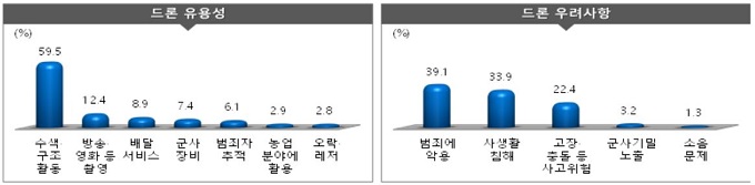 드론의 경우, 과반수 이상이 ‘수색·구조활동(59.5%)’에 가장 유용할 것으로 전망한 반면, ‘범죄에 악용 가능성(39.1%)’, ‘사생활 침해(33.9%)‘, ’사고 위험성(22.4%)‘ 등에 대해 우려하는 것으로 나타났다.