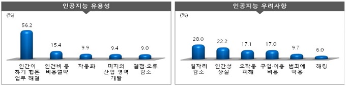 ‘인간이 처리하기 힘든 업무해결(56.2%)’이 인공지능 분야의 가장 유용한 서비스로 인식했으며, 인공지능 사용의 보편화시 ‘일자리 감소(28.0%)‘, ’인간성 상실(22.2%)‘ 등의 가능성을 우려하는 것으로 조사됐다.