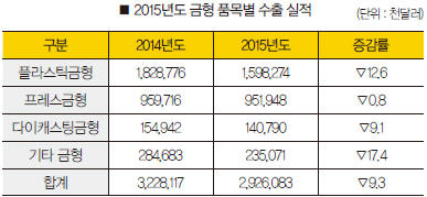 꽁꽁 얼어붙은 내수경기가 좀처럼 풀리지 않은 가운데, 2015년 우리나라 금형산업은 세계 경제 악화 등으로 매년 증가하고 있던 수출이 전년대비 하락했다. 특히 우리나라 전체 금형수출의 32.5%를 차지하는 중국과 일본으로의 수출이 하락함에 따라 전체 수출에 막대한 영향을 끼친 것으로 보인다. 이에 따라 우리나라 금형산업이 특정 국가의 경제 악화 등에서 수출 경쟁력을 확보하기 위해서는 다양한 수출 판로개척과 부가가치를 높일 수 있는 신기술 개발 등이 필요해 보인다.