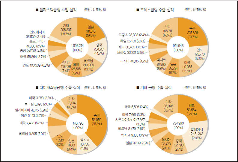 특히 베트남 22.9%, 미국 20.5%로 전년대비 수출이 크게 증가했음에도 불구하고, 우리나라 금형 교역에서 큰 비중을 차지하고 있는 일본과 중국 수출의 부진으로 감소한 것으로 분석된다.