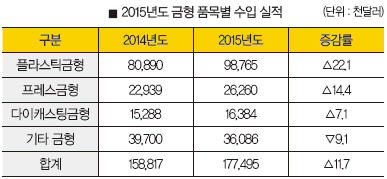 우리나라의 2015년 금형 수입은 총 1억7,749만 달러를 기록해 2014년 수입 1억5,881만 달러와 비교해 11.7% 증가했다.