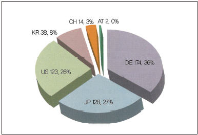 국가별 출원에서는 한국의 경우 2000년대 들어서면서 매년 특허출원이 꾸준히 이루어지고 있으나 출원량은 미국이나 유럽에 비해 미비한 상태이다.