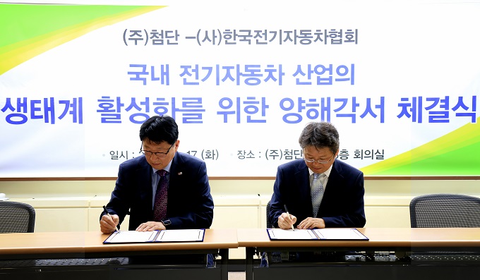 (주)첨단(대표 차남주)은 17일 (사)한국전기자동차협회(회장 김필수)와 국내 전기자동차 산업의 발전을 위한 포괄적 업무 협력 양해각서(MOU)를 첨단빌딩 5층 대회의실에서 체결했다.