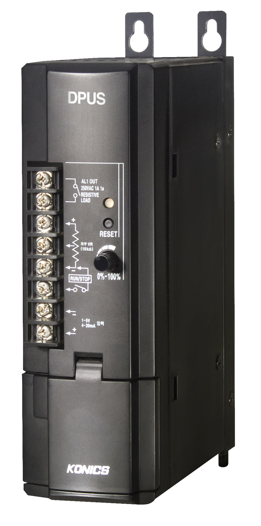 코닉스의 디지털 전력조절기(DPUS 시리즈)는 가로 폭 50mm의 슬림 사이즈이다. 이 제품은 위상제어와 제로크로싱 가변 주기 사이클 제어 방식을 지원해 다양한 부하 제어를 실현할 수 있다.
