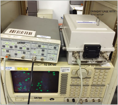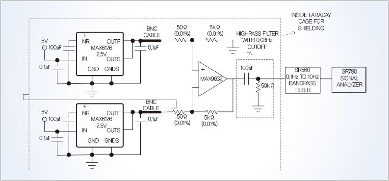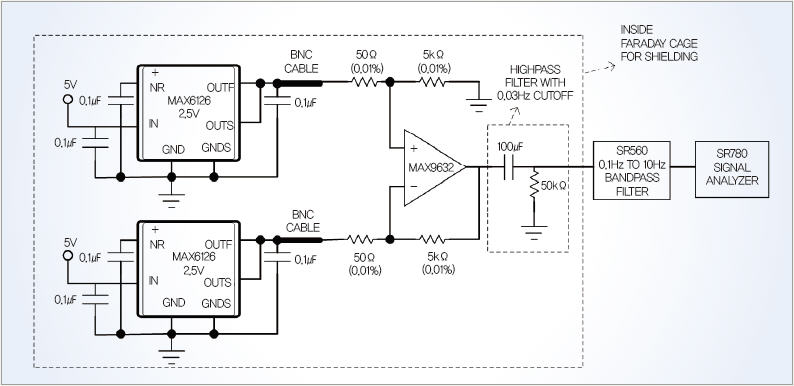 위 실험의 구성에는 한 쌍의 MAX6126 초저 잡음 전압 레퍼런스를 이용한다. 그림 2의 세부 구성에 표시된 점선은 모든 테스트 회로가 패러데이 금속 케이지로 외부 환경과 차단됐다는 것을 나타낸다. 자세한 벤치 구성은 그림 6, 그림 7에 나타나 있다.