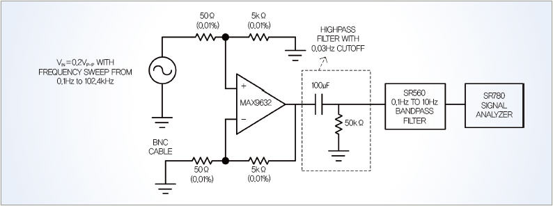 그림 3의 구성은 그림 2에 나타난 잡음 측정 구성의 주파수 응답을 평가하기 위해 사용된다. 이 경우 테스트 신호는 차동 증폭기의 입력단 하나에 적용되고, 나머지 입력단은 접지에 연결된다.
