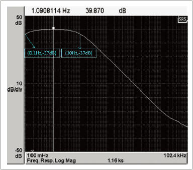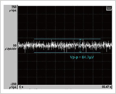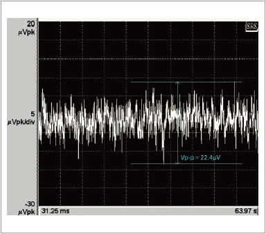 그림 9에 나타난 바와 같이, 그림 2의 구성에서 사용된 잡음 제거(NR) 커패시터가 디지키(Digikey) 유통에서 구입한 100㎌(X5R, 10V, 1206 사이즈) 커패시터로 변경됐다. 이 대용량 100㎌ 커패시터는 그림 10과 같이 0.1Hz∼10Hz 잡음을 개선한다.