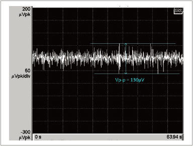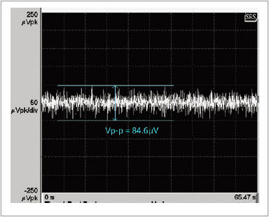 그리고 그림 5는 교정(Calibration) 잡음의 시간영역 출력 구성을 나타낸다. 이 구성에서 입력단은 접지와 연결돼 있다. 출력 잡음은 64초 타임 슬롯 내에서 기록되며, 주파수 영역에서 0.1Hz에 해당되는 10초가 넘는 것이 확실하다. 이것이 유용한 이유는 전체 64초 시간 내 어떤 10초 구간에서도 피크-피크(Peak to Peak) 값에 거의 변화가 없기 때문이다. 그림 6은 벤치 구성과 사용된 장비 사진을, 그림 7은 이 구성의 세부 요소를 나타낸 것이다.