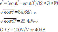 전압 레퍼런스를 삭제하고 차동 증폭기 입력단을 접지에 연결함으로써 이 구성의 잡음을 따로 측정할 수 있다. 이 경우 출력 잡음 신호 eout0은 e0의 결과값이다. 이것은 식 (6)과 같이 표시할 수 있다.