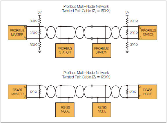 (그림 1)은 PROFIBUS-DP 에 사용되는 케이블과 터미네이션 네트워크가 RS485와 어떻게 다른지 보여준다.