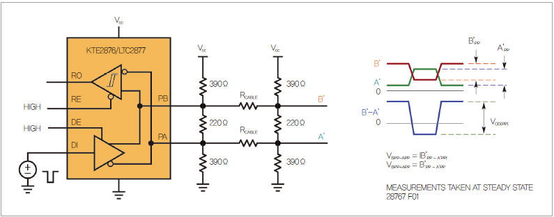 여기서 VOD(파란색 선)는 PROFIBUS-DP 규격을 완벽하게 만족하는 것을 보장하기 위해 ‘케이블의 끝’(A’와 B’)에서 수행한 측정으로부터 생성됐다. 또 두 표준과 VOD 호환성을 보장하기 위해 LTC2877은 RS485 부하를 이용해 완전히 테스트됐다.