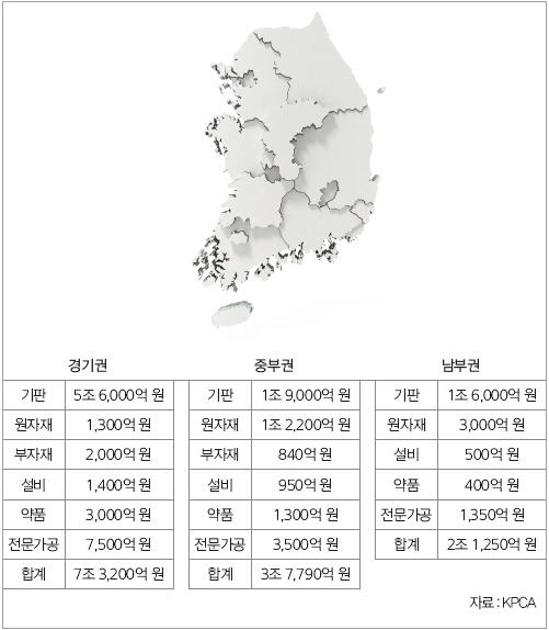 지역별로 보면, 경기권이 가장 큰 7조 3,200억 원 규모로 집계됐고, 중부권이 3조 7,790억 원, 남부권이 2조 1,250억 원으로 조사됐다. 각 지역에서 품목별로는 기판이 차지하는 비중이 가장 높았고, 다음으로 경기권은 전문가공이, 중부권과 남부권은 원자재가 차지하는 비중이 뒤를 이었다(그림 1).