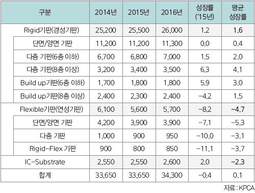 2015년 국내 전자회로기판 생산량은 전년 대비 0.4% 감소한 33,650천m2였으며, 2016년은 1.9% 성장한 3,300m2으로 전망됐다. 연성 기판은 스마트 디바이스 감소로 8.2% 줄었고, 단위 면적당 고부가 기판인 반도체 기판은 2,550천m2로 2.0% 전년도와 동일한 실적을 나타냈다. 2016년은 SET업체의 신규 모델에 채용되는 고기능 반도체PKG 기판인 부품내장 기판, AP용 FC-CSP, 무선용 전층IVH 등 고기능 기판 중심으로 생산을 확대하며, 1.9% 성장한 34,300천m2를 기록할 것으로 전망됐다(표 3).