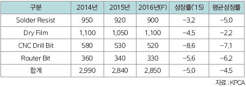 올해 국내 전자회로기판 시장 규모는 13조 원으로 전년 대비 소폭 성장할 전망이다. 한국전자회로산업협회(KPCA)가 발간한 보고서에 따르면, 2016년 국내 기판 생산은 모바일기기용 IC-Substrate(반도체PKG 기판), 네트워크용 고다층 기판 등 고기능 기판 중심 및 전장용 기판의 소폭 생산 증가로 1.1% 성장한 9조 2,000억 원을 기록할 것으로 전망됐다. 3년 만에 성장세로 돌아설지 주목된다. 원자재 생산 규모는 4.2% 증가한 1조 7,200억 원, 부자재와 설비는 각각 3.2%, 15.8% 감소한 2,750억 원, 2,400억 원으로 예측됐다(표 1).