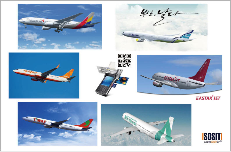 SOS정보기술에 의하면 국내 대형 항공사 한 곳을 빼고는 국내 아시아나 항공, 에어부산, 제주항공, 이스타항공, 티웨이항공, 금년 내에 출항하는 에어서울까지 많은 항공사가 이미 서서 돌아다니는 POS 시스템을 완벽하게 구현하고 있다.