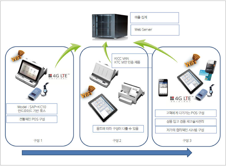 평소에는 IC와 MSR 카드 리더가 붙어 있는 도킹 시스템에 앉아 있다가, 고객이 원하면 태블릿 POS를 들고 고객에게 다가가 무선 블루투스 스캐너(PM-3)로 상품을 선택한 후에, 판매도 하고 반품 및 교환 처리도 하며, 카드 결제도 도킹시스템(SAP-KC10)과 떨어진 곳에서 KTC 보안 인증을 받은 IC 카드 일체형 프린터에 의해 카드(KICC VAN) 승인까지 처리한 상태로, 카드 영수증을 발급을 받을 수 있는 시스템을 구현하여 일부 현업에서 성공적인 적용되고 있다.