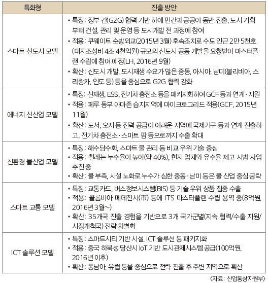 스마트시티는 기획·설계, 친환경 인프라, ICT 부품 소재, 개발 금융 등이 결합된 융복합 상품이며 4차 산업혁명의 신산업 플랫폼이라고 할 수 있다. 단일 프로젝트로도 높은 수주금액과 함께 양질의 일자리 창출이 가능한 메가 프로젝트인데, 특히 개도국 등은 단기간 이루어진 고도 경제성장과 높은 도시화를 달성한 한국의 도시개발 모델에 큰 관심을 보이고 있으며, 벤치마킹과 협력 강화를 희망하고 있다.