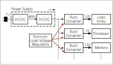 다이어그램 왼쪽 점선 안의 상자는 PC 전원 케이블의 브릭처럼 시스템 가까이에서 볼 수 있는 경우가 많다. 그에 반해 벅 컨버터는 시스템 보드 그 자체에서 볼 수 있다. 각각의 컨버터가 중간 전압(여기에서는 12V)을 취한 후, 시스템의 전자 부품들을 위해 더 낮은 전압으로 스텝다운시킨다. 일부 시스템의 경우에는 이 점선 상자와 온보드 컨버터가 추가된 중간 전압들로 인해 더 많은 단계들로 분리될 수도 있다.