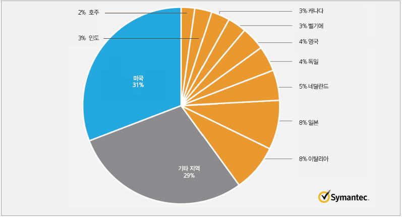 또한, 파일을 암호화하고 금전을 요구하는 크립토 랜섬웨어(crypto-ransomware)의 확산이 지속됐다. 올해 발견된 랜섬웨어 가운데 단 1개를 제외하고는 모두 크립토 랜섬웨어로 밝혀져, 크립토 랜섬웨어가 가장 효과적인 형태로 자리매김하고 있음을 알 수 있다. 국가별 감염 현황을 보면, 전체 감염 건수에서 31%를 차지한 미국이 가장 높았고, 이어서 이탈리아(8%), 일본(8%) 순이었다. 한국은 28위로 랜섬웨어 감염국 TOP 30에 포함됐다.