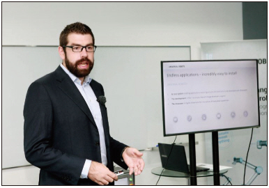 ▲앤드류 피터 유니버설로봇 APAC지사 기술지원 총괄책임자가 UR 안전기술과 UR 플러스에 대해 소개하고 있다.