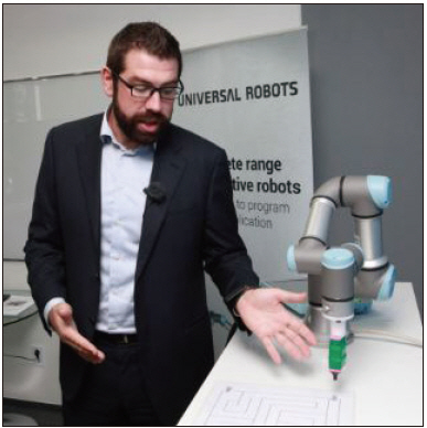 ▲UR3를 움직이며 종이 위해 그려진 미로를 빠져 나오는 ‘미로 찾기’ 시연 모습. 본드 칠이나 스프레이 등 일정한 속도를 유지하는 것이 중요한 공정에 적용할 수 있다.