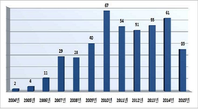 관련 기술 출원은 2004년 2건, 2005년 4건, 2006년 11건으로 서서히 증가하다가, 2009년 40건, 2010년 67건까지 급증한 뒤, 매년 30건 이상 꾸준하게 출원되고 있는 것으로 조사됐다.