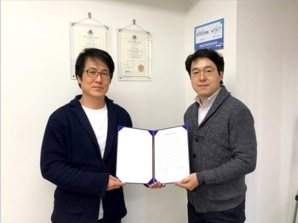 ▲ 빛컨과 와이즈 아이티가 업무협약을 체결했다. 왼쪽부터 와이즈 아이티의 아오야마 대표, 빛컨 김민규 대표
