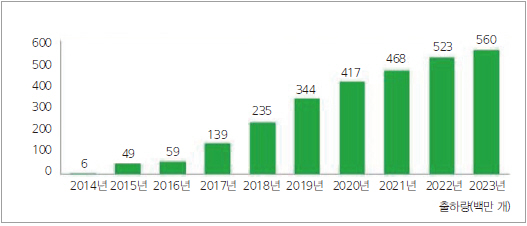 더 많은 스마트폰 제조업체가 플렉서블 디스플레이 기술을 사용해 디자인을 제작함에 따라 2017년 플렉서블 디스플레이의 출하 대수가 1억 3,900만 대로 2016년에 비해 135% 증가할 것으로 예상되고 있다(그림 1). IHS Markit는 2017년에 전체 디스플레이 장치 출하량에서 플렉서블 디스플레이가 3.8%를 차지할 것으로 예상했다.