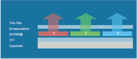 AMOLED는 크게 기판(Substrate)과 TFT(Thin Film Transistor), 유기박막층, 박막봉지(Thin Film Encapsulation)로 구성된다. 구조가 단순하고 백라이트(Back Light)가 없는 것이 AMOLED의 가장 큰 특징이라 할 수 있다.