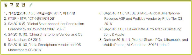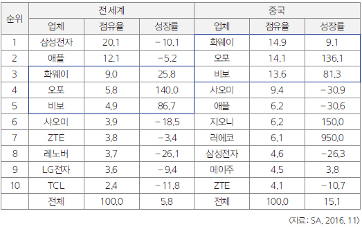 중국 업체의 스마트폰 출하는 글로벌 시장이 전반적으로 정체되어 있음에도 불구하고 두 자릿수 성장세를 유지하고 있으며, 그 결과 스마트폰 시장 점유율은 2016년 3분기에 40%를 돌파하는 모습을 보였다. 이는 프리미엄 제품에 버금가는 성능이나 디자인을 구현하면서도 가격은 절반에 가까운 제품들을 앞세워 글로벌 시장 장악력을 확대한 덕분이라고 할 수 있다. 특히 화웨이(7.5% → 9.0%), 오포(2.5% → 5.8%), 비보(2.8% → 4.9%)의 글로벌 시장 점유율은 전년 동기대비 상승했지만, 삼성전자(23.7% → 20.1%), 애플(13.6% → 12.1%)은 하락세를 나타냈다.