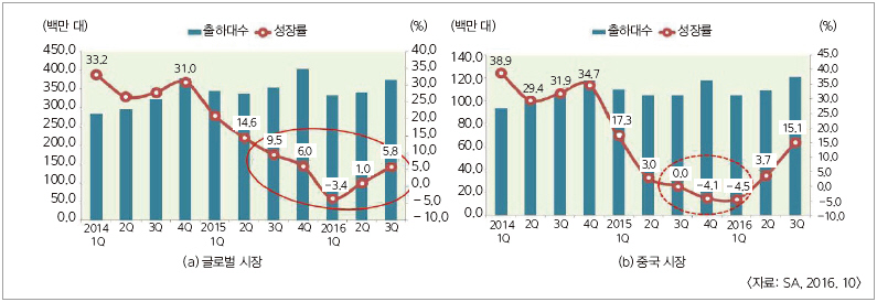 2015년 3분기 이후 글로벌 스마트폰 시장 성장률은 한 자릿수에 머물고 있으며 세계 시장을 견인하던 중국도 보급률 포화로 2016년 상반기 한때 마이너스 성장을 기록했다. 이제 스마트폰 시장이 충분히 성숙하고 단말기 자체의 하드웨어 스펙이 상당한 수준에 이르면서, 주요 선진국을 중심으로 스마트폰의 교체 주기가 더욱 길어지는 양상을 보이고 있다.