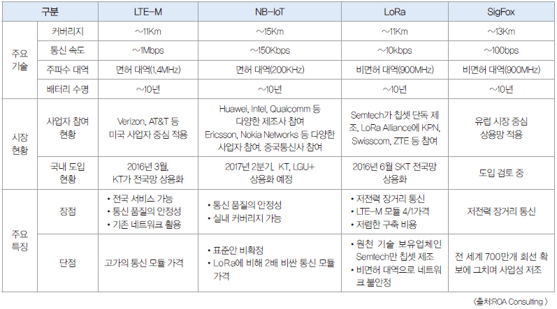 ▲ 표 3. 경쟁이 예상되는 주요 IoT 네트워크 관련 현황