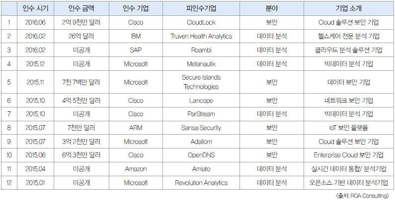 실제로 Cisco나 SAP, IBM, Microsoft를 비롯한 대형 IT 기업의 경우 최근 보안이나 데이터분석과 관련된 기술 보유 업체 인수를 서두르고 있다.