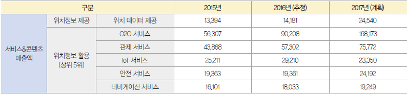 조사 결과, 2017년 위치정보시장 매출규모는 약 5,340억 원 규모로 2016년 3,152억 원 대비 약 1.7배 성장할 것으로 전망된다.