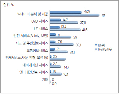 사업자들은 향후 1~2년 내 위치정보서비스를 활용한 빅데이터 분석 및 제공(42.9%), O2O서비스(14.7%), IoT서비스(13.4%) 등이 활성화되어 4차 산업혁명시대에 융합 산업 발전을 견인할 것으로 전망했다.