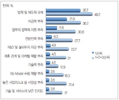 한편, 사업자는 기업을 운영하는데 가장 큰 어려움이 법적 및 제도적 규제(35.7%)라고 답했다. 자금력 부족(21.9%)과 정부의 정책적 지원 부족(11.6%)이 뒤를 이었다(그림 5).