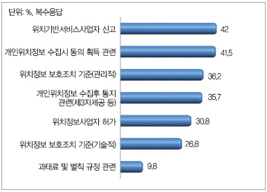 그 중에서도 ‘위치정보의 이용 및 보호 등에 관한 법률’과 관련한 위치기반서비스사업자 신고(42%), 개인위치정보 수집 시 동의 획득(41.5%), 위치정보보호조치 기준(36.2%) 부분에서 규제 완화가 필요하다고 응답했다.