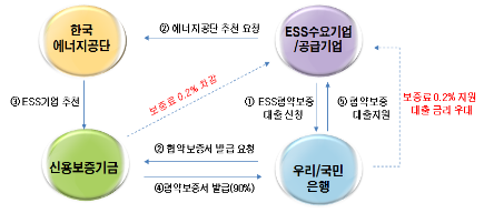 우리은행 또는 국민은행에 대출을 신청하고 에너지공단에 추천서 발급을 요청하면, 에너지공단은 ESS 생산ㆍ설치계획 등을 검토해 신용보증기금에 추천서를 발급한다. 추천서를 발급받은 신용보증기금은 대출금액의 90%까지 보증 비율을 확대하고, 0.2%p의 보증료율을 차감하는 등 사업자의 보증부담을 줄이는 보증서를 발급한다.