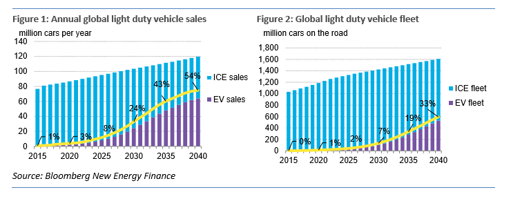 연구팀은 2040 년 전기차의 전세계 경량차량 판매 점유율이 작년의 35%보다 높은 54%를 차지할 것으로 추정했다. 2040 년까지 전기차는 하루 800 만 배럴의 수송 연료를 대체할 것이며 전세계 전력 소비량의 5%를 추가할 것으로 예상했다.